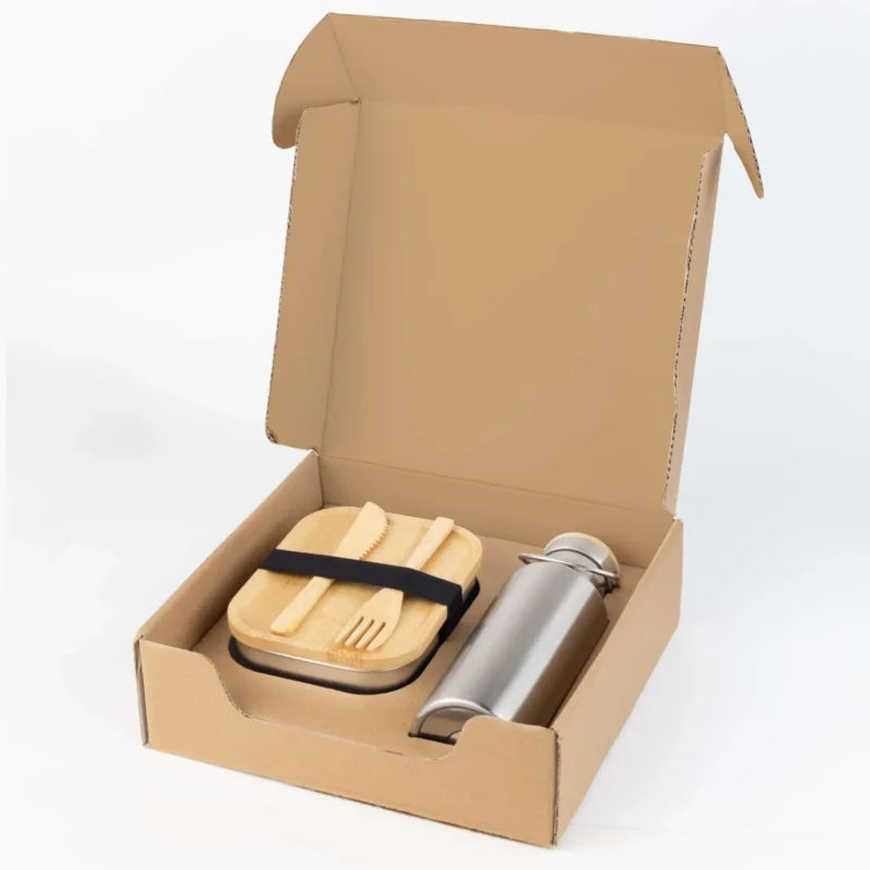 This beautifully paired set includes a 500ml Stainless Steel Bottle and an 800ml Lunch Box adorned with a Bamboo Lid, offering the perfect blend of style and sustainability.
