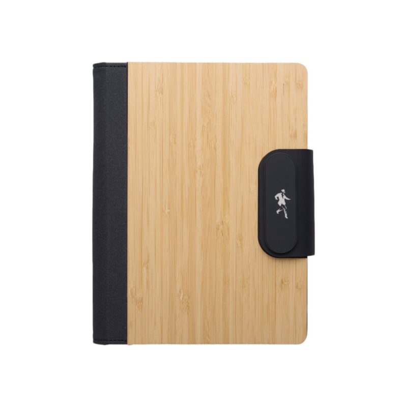 The BambooBoost Folio is a premium eco-friendly organizer crafted from RPET and bamboo materials. It features a 15W wireless charger, an 5000mAh built-in power bank, and multifunctional storage, including a mobile/tablet holder and A5 notebook. The folio also includes a light-up logo on the loop, a pen loop, and comes with an aluminum pen with bamboo accents and a stylus for touch screen devices. A versatile and sustainable corporate gift that combines practicality with modern design.