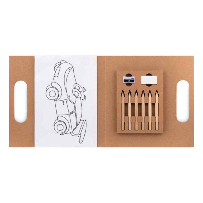 Includes 6 colouring pencils, sharpener and eraser.