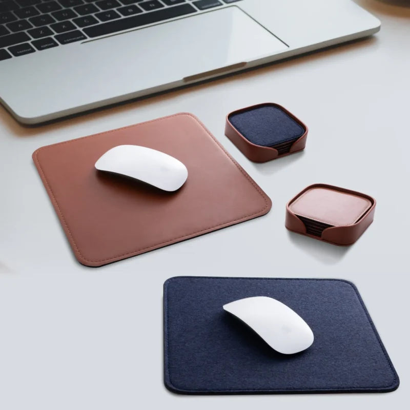 Both products are made of a combination of attractive blue felt and elegant brown vegan leather. Both, the felt side and the vegan leather side can be used as a mousepad or coaster so that you can easily change the look and feel of your desk.