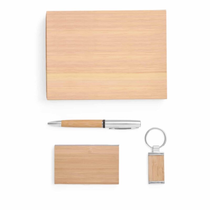 A captivating blend of natural grace and contemporary elegance. This includes a bamboo and steel combined cardholder, a matching ball pen, and a stylish keychain.