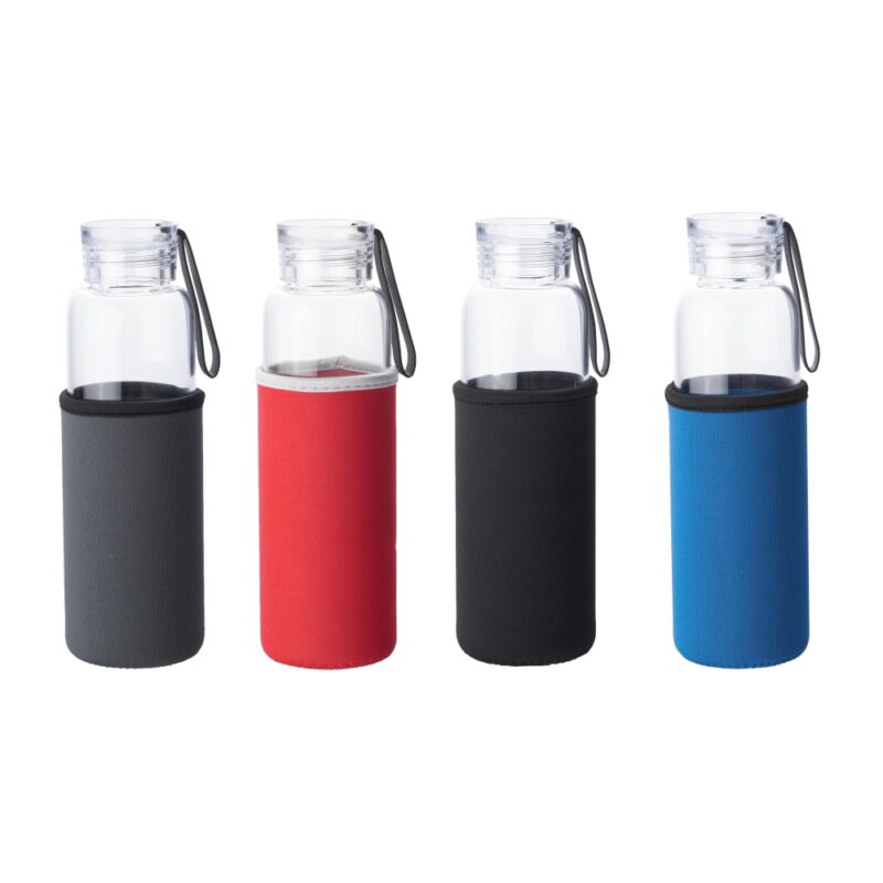 Premium 500ml Glass Bottle with a Neoprene Sleeve and a Strap which makes it easy to carry around. Available with jute or Neoprene sleeves.