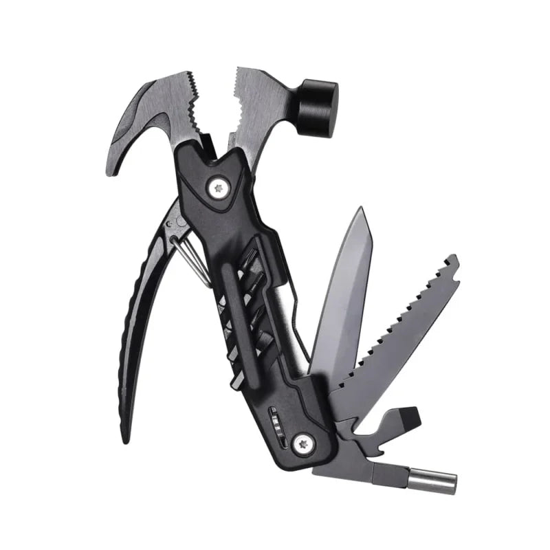 Multi-tool hammer made from stainless steel, aluminium and plastic handle. Flat Nose pliers, regular pliers, wire cutter, hammer, nail drawer, knife, saw and nail file, flat screw driver and bottle opener, bit set holder with lock mechanism.
