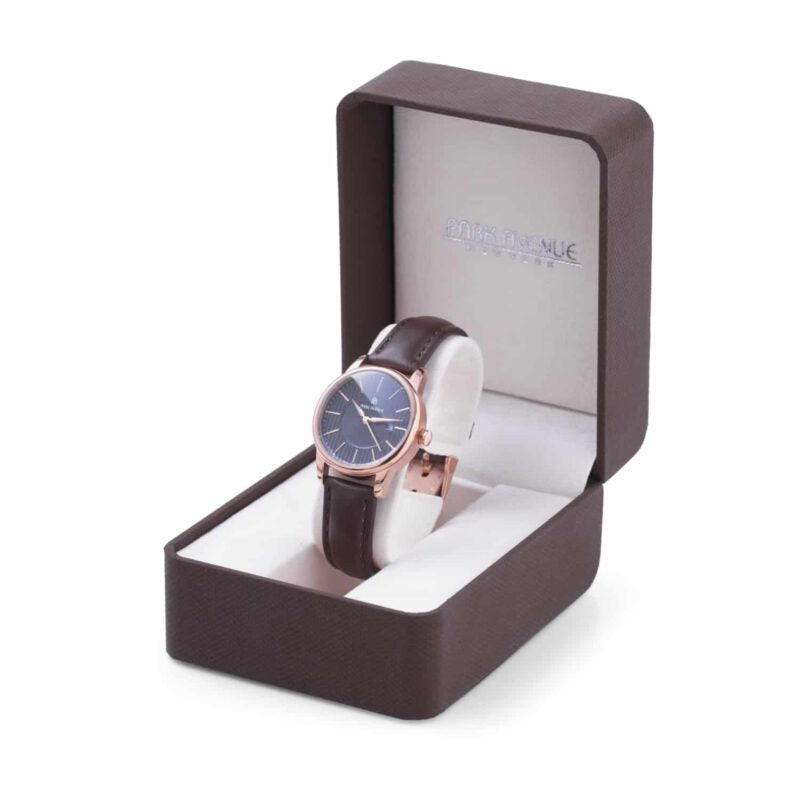 A Park Avenue ladies watch in a round shape and rose gold trims.