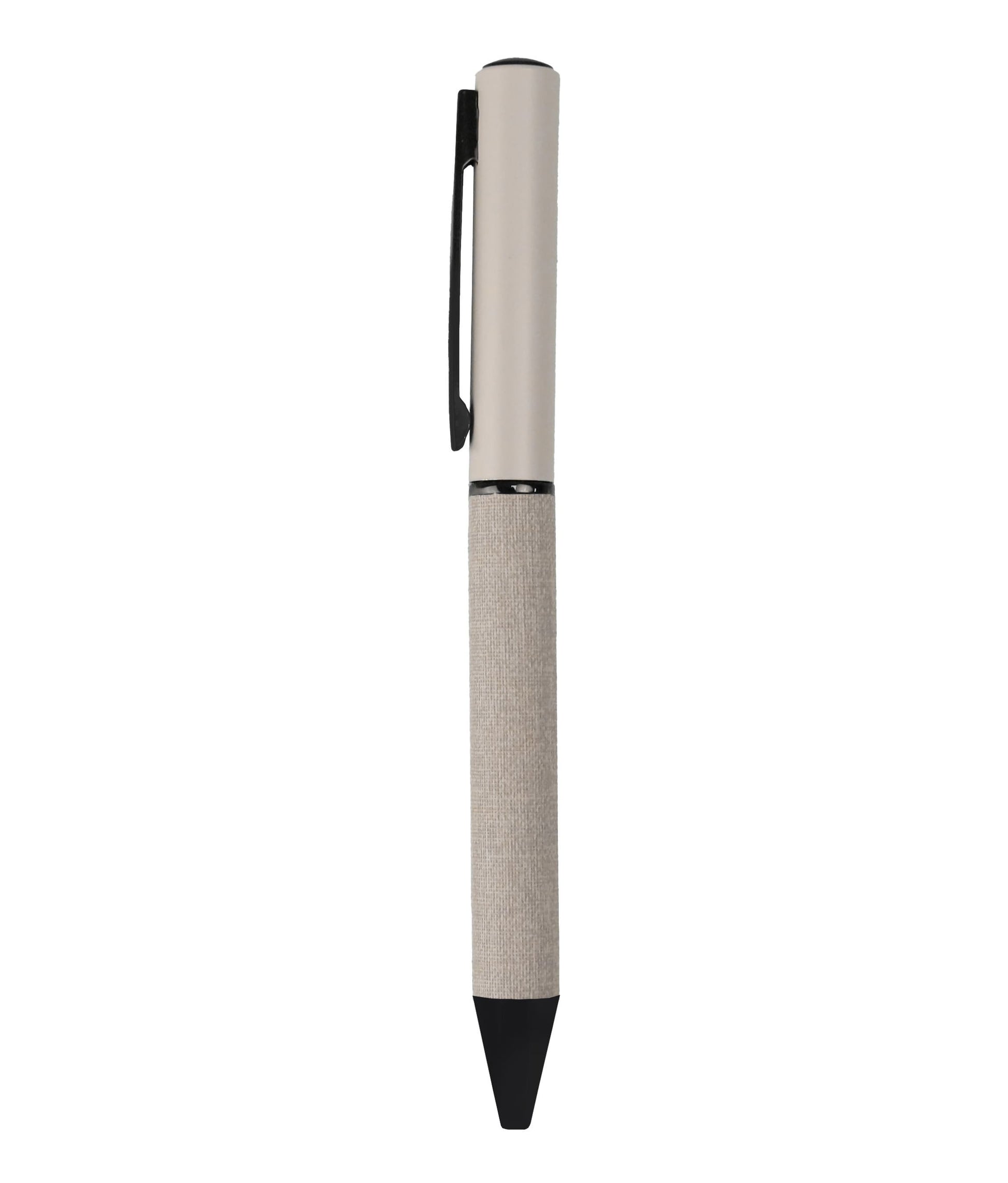Twist action metal ball pen German built with blue ink. It features a black top barrel, clip and tip.