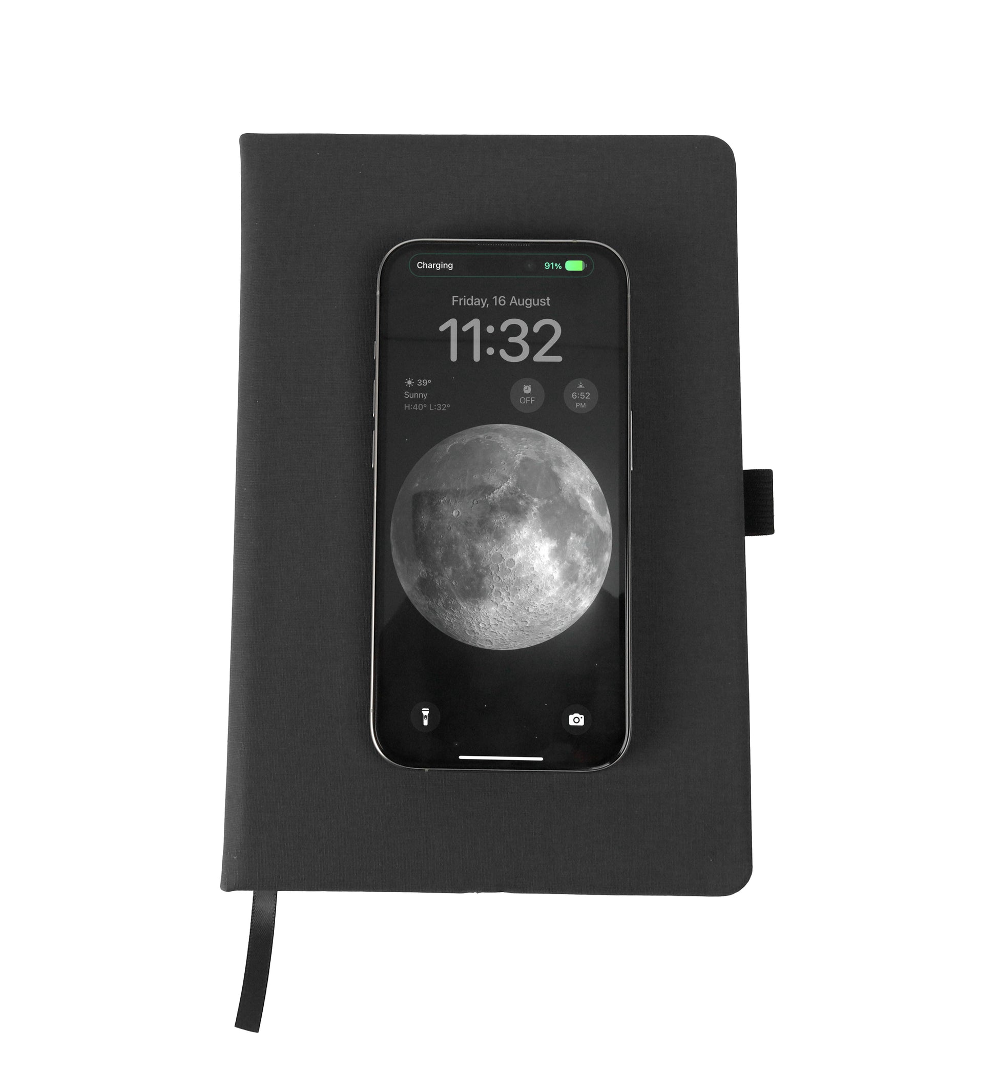 A Magsafe notebook with 80 sheets with 10W wireless charging, Comes with a removable mobile & business card holder which can also be used as notebook closure.