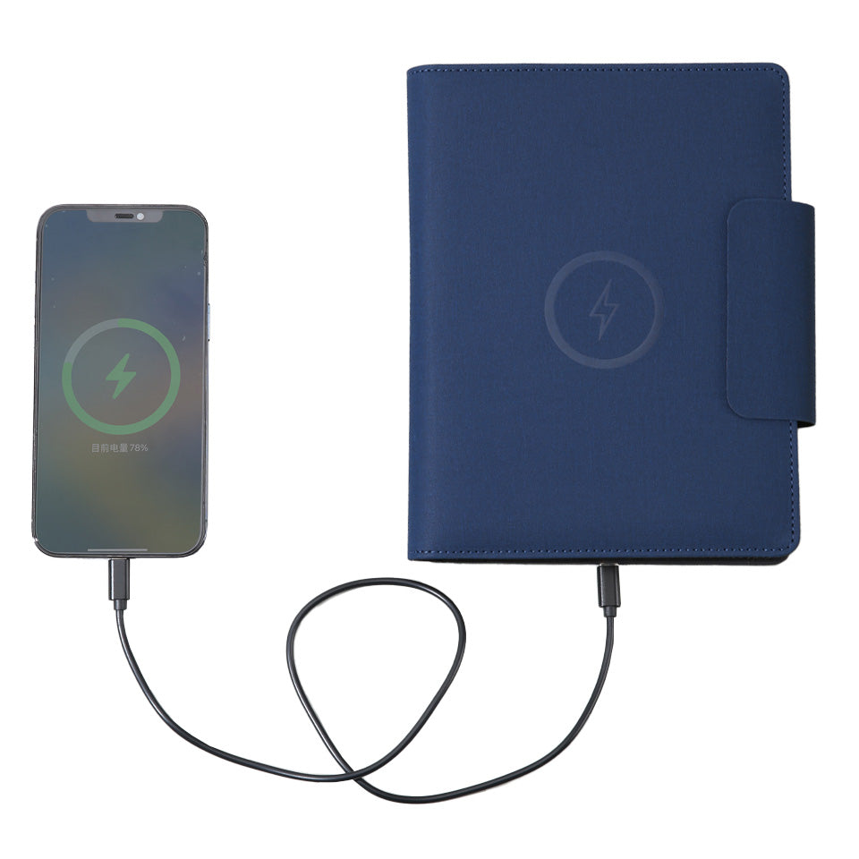 An organizer with 8000 mAh power bank and 10 W wireless charger. Comes with a 64 sheet notebook in a black box.