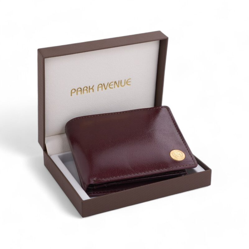 Park Avenue genuine leather dual-tone men’s wallet with an extra removable flap for credit cards packed in a rich suede box.