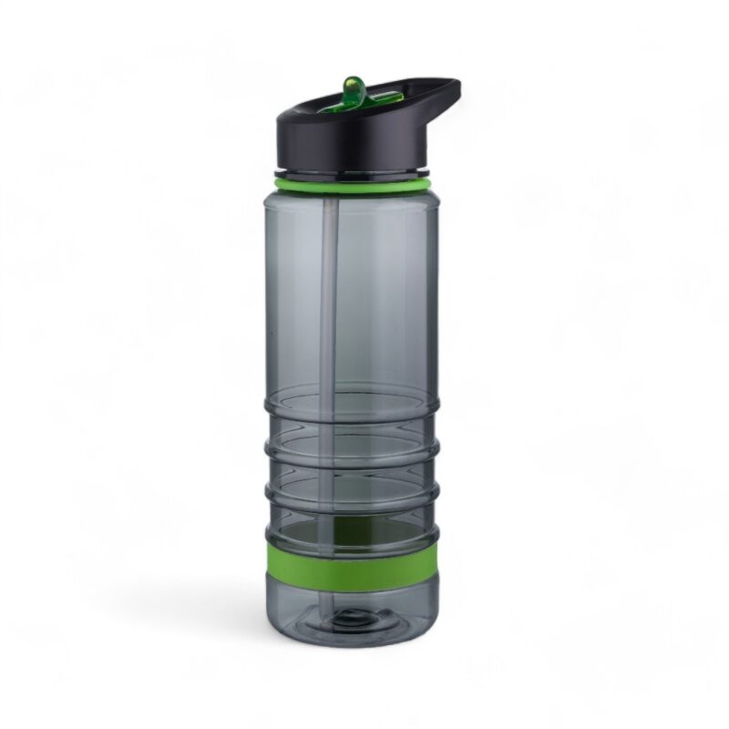 BPA free Tritan sports bottle assists in fitness activities with a built-in sipper and a holder. Comes in a blackish translucent body with green accents and a blackish translucent body with blue accents.
