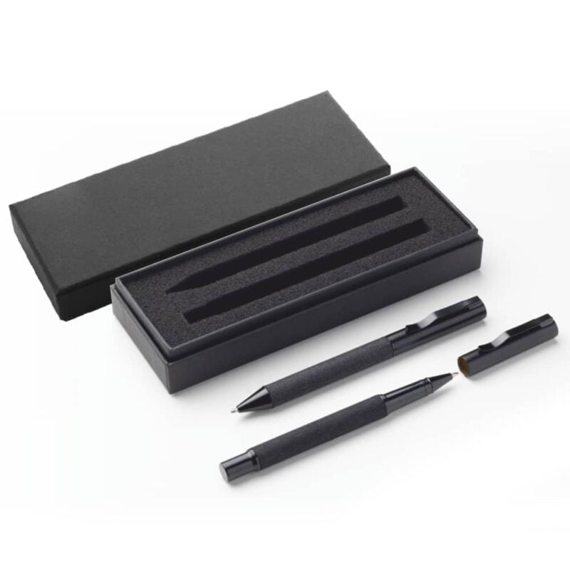 RPET fabric wrapped metal ballpoint and roller pen with blue refill. Comes in a cardboard box.