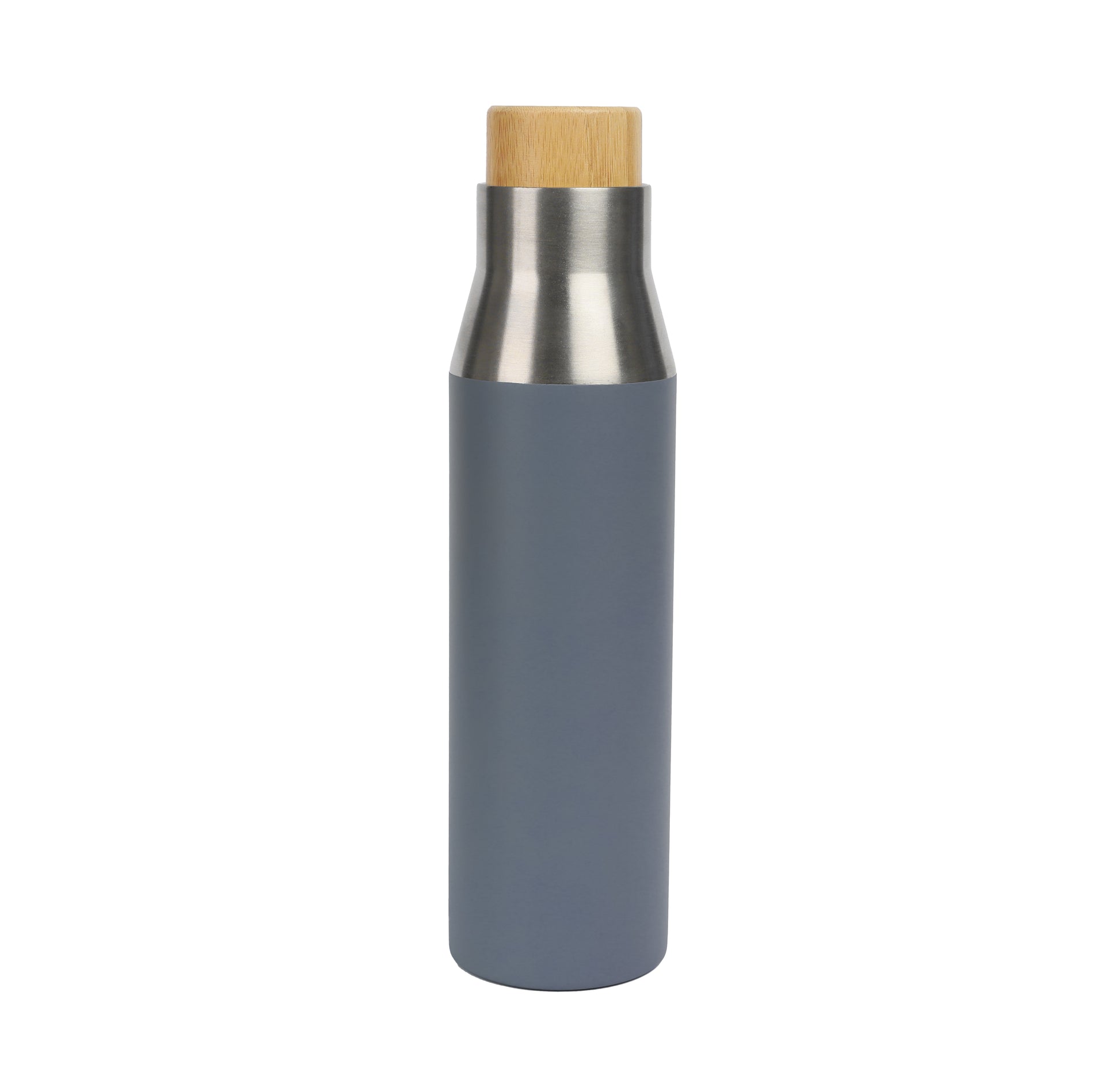 A bottle made with stainless steel with a powder coated body and a bamboo lid. The lid features a food grade silicon lid making it leak-proof.